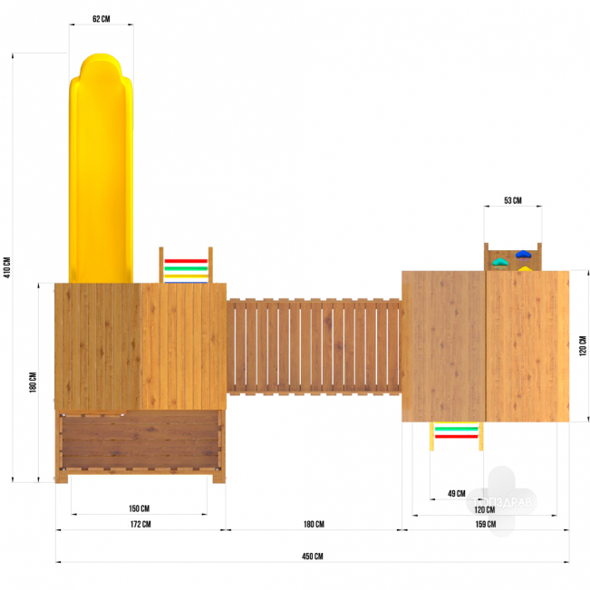 Игровая площадка изготовлена из клееного соснового бруса и массива сосны .Дерево обработано безопасной декоративно-защитной пропиткой. Технология значительно увеличивает срок службы конструкций, повышает прочность древесины, защищает её от гниения и грибков.