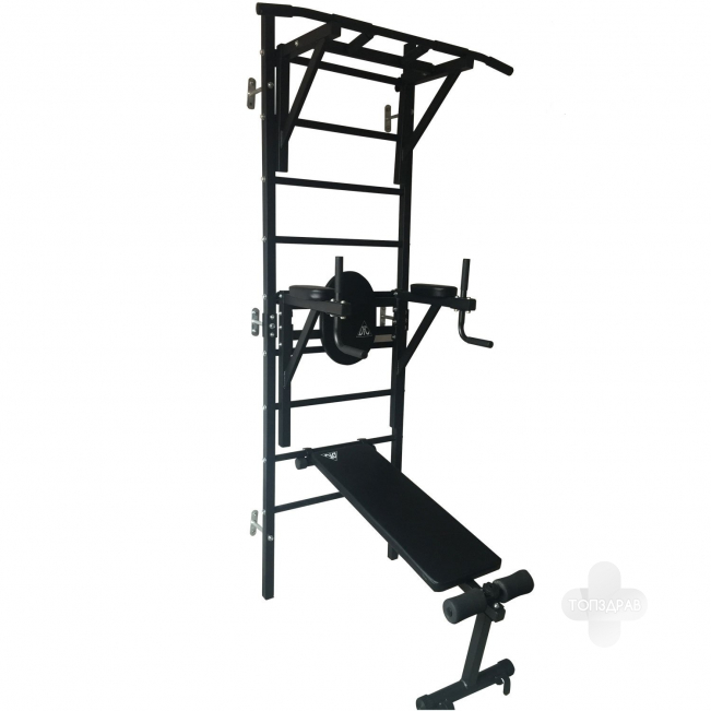 Турник длиной 110 см и брусья оснащёны мягкими неопреновыми ручками, очень легко перевешиваются на перекладины шведской стенки, что позволяет менять их высоту. Расстояние от ручек турника до шведской стенки (вынос турника) - 51 см. Размер подушки составляет 35 х 27 см, а подлокотников 25,5 х 12,5 см. Толщина подлокотников и подушки - 4 см. J-образные ручки размерами 15,5 и 17,5 см, расстояние между ними - 56,5 см.